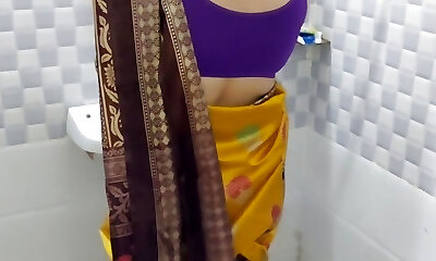 Yellow Saree Mein Apni ko Nahate Dekh Kr Raha Nahi Gya To Unko Douche Mein Hello Ghus Kar Tang Utha Kr Choda