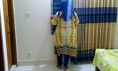 Tamil MILF Stepmother Stuck Under Bed with white saree & black blouse, when she cleaning under bed then stepson fuck her